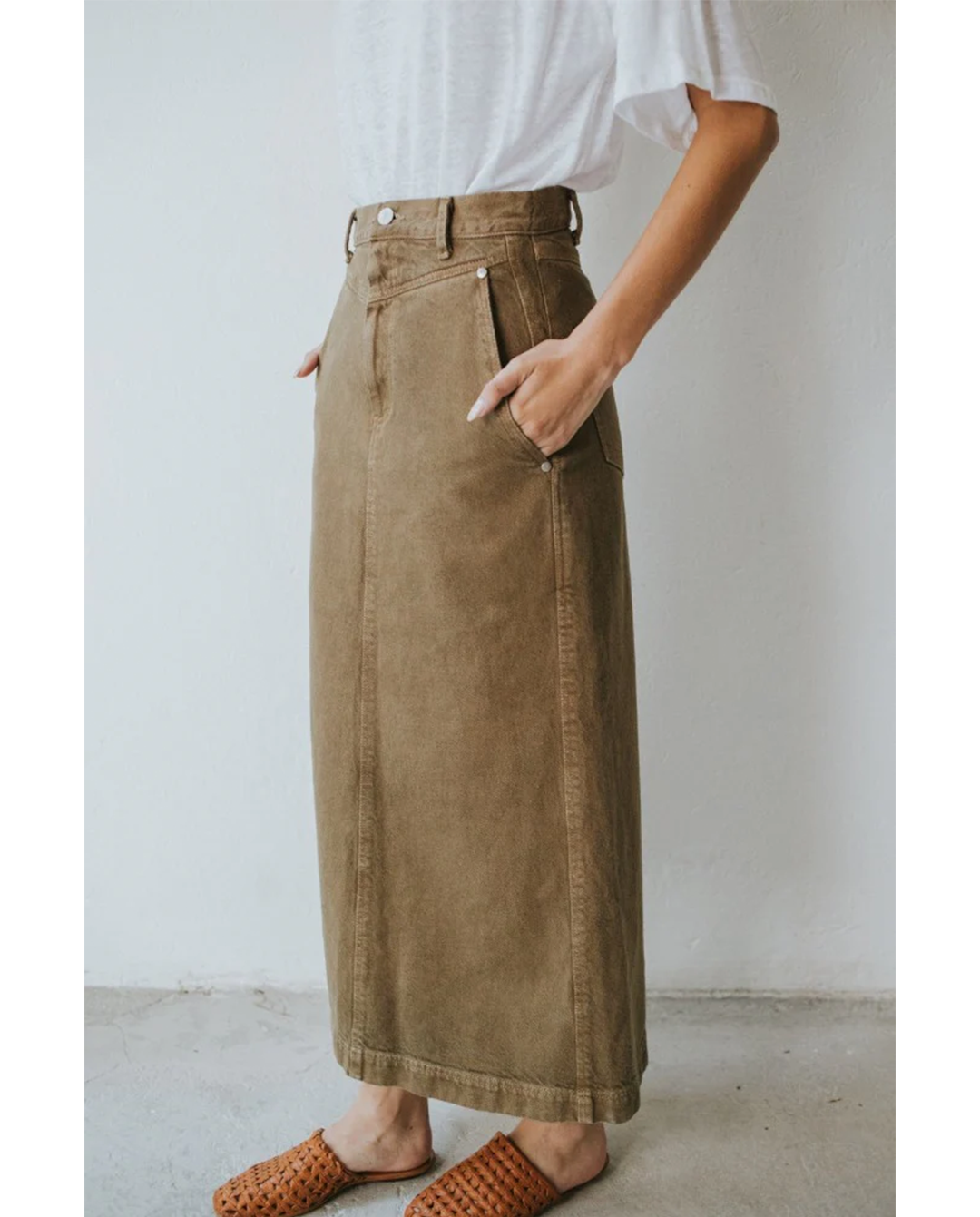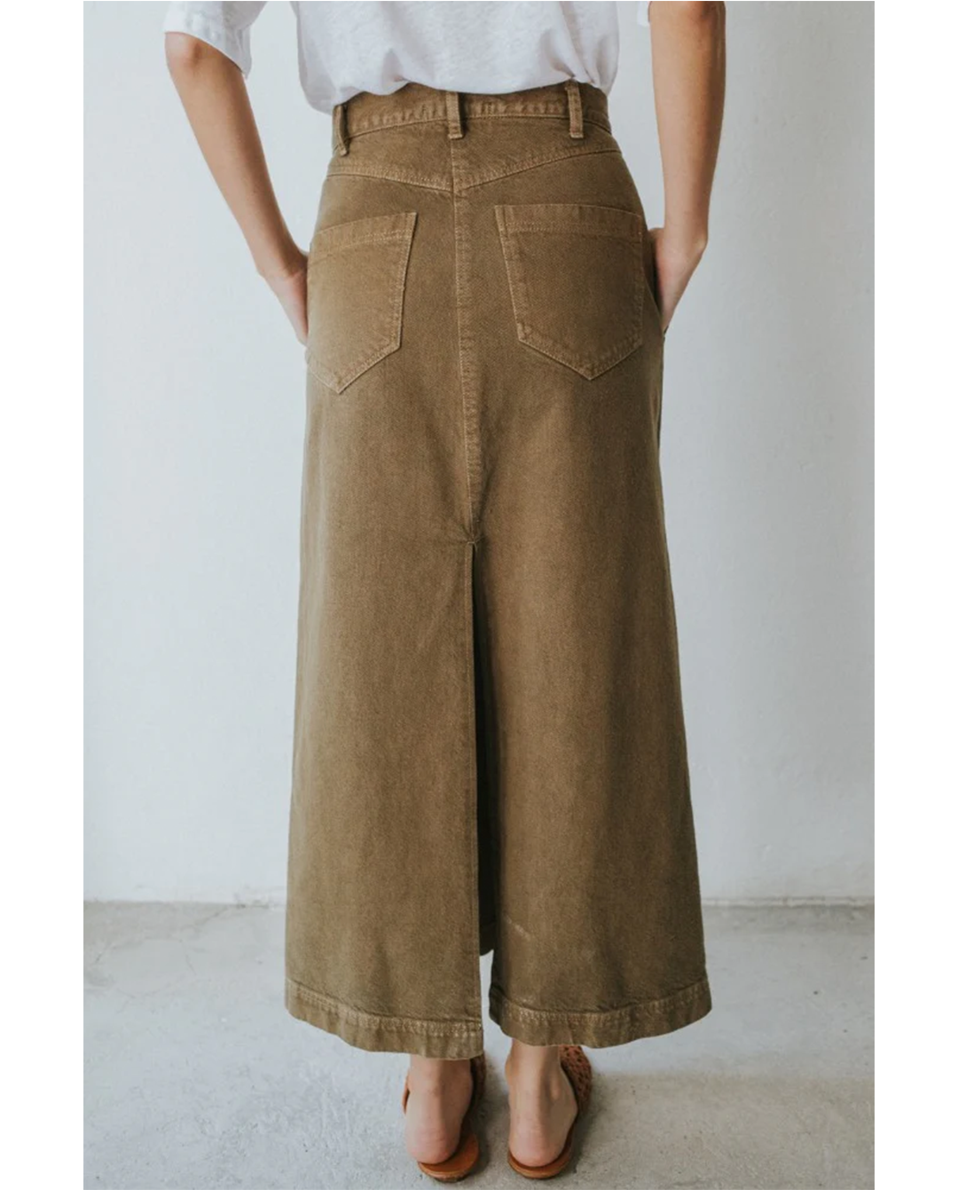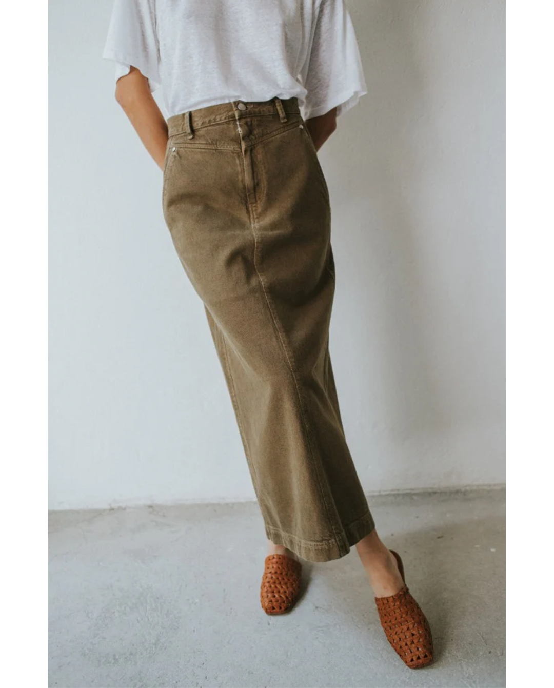 Falda midi de mezclilla fabricada por productores locales. Silueta tipo A con bolsillos ocultos en los costados y de parche en la parte trasera, abertura arriba de la rodilla en la parte de atrás y pretina con trabas funcionales. Cierra al frente con botón y cierre metálico oculto.