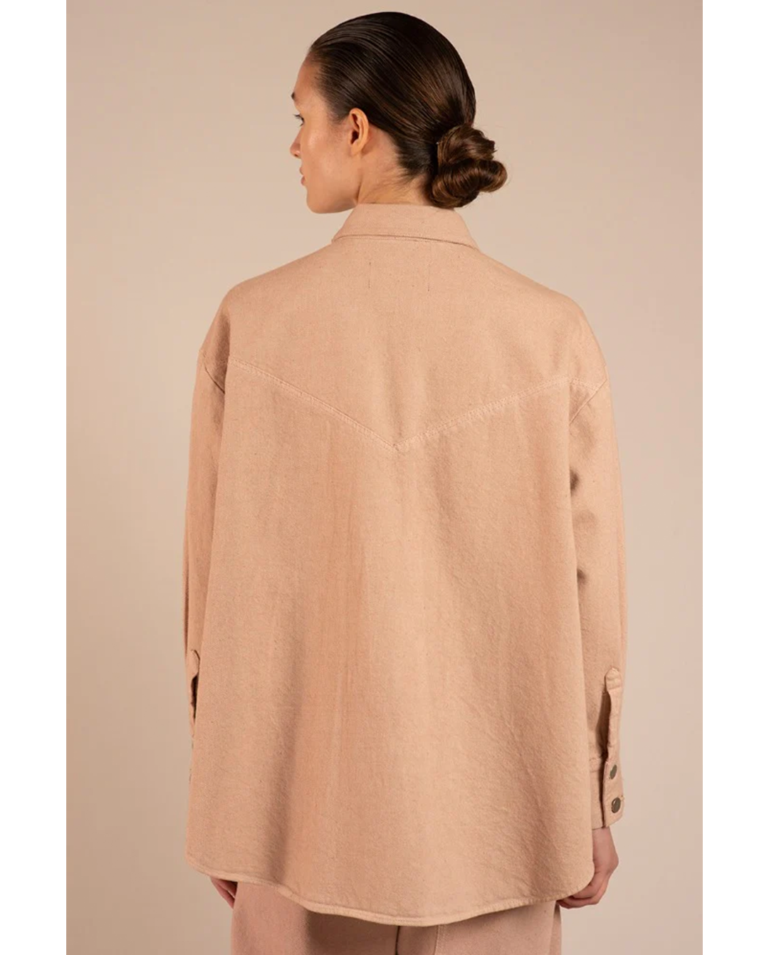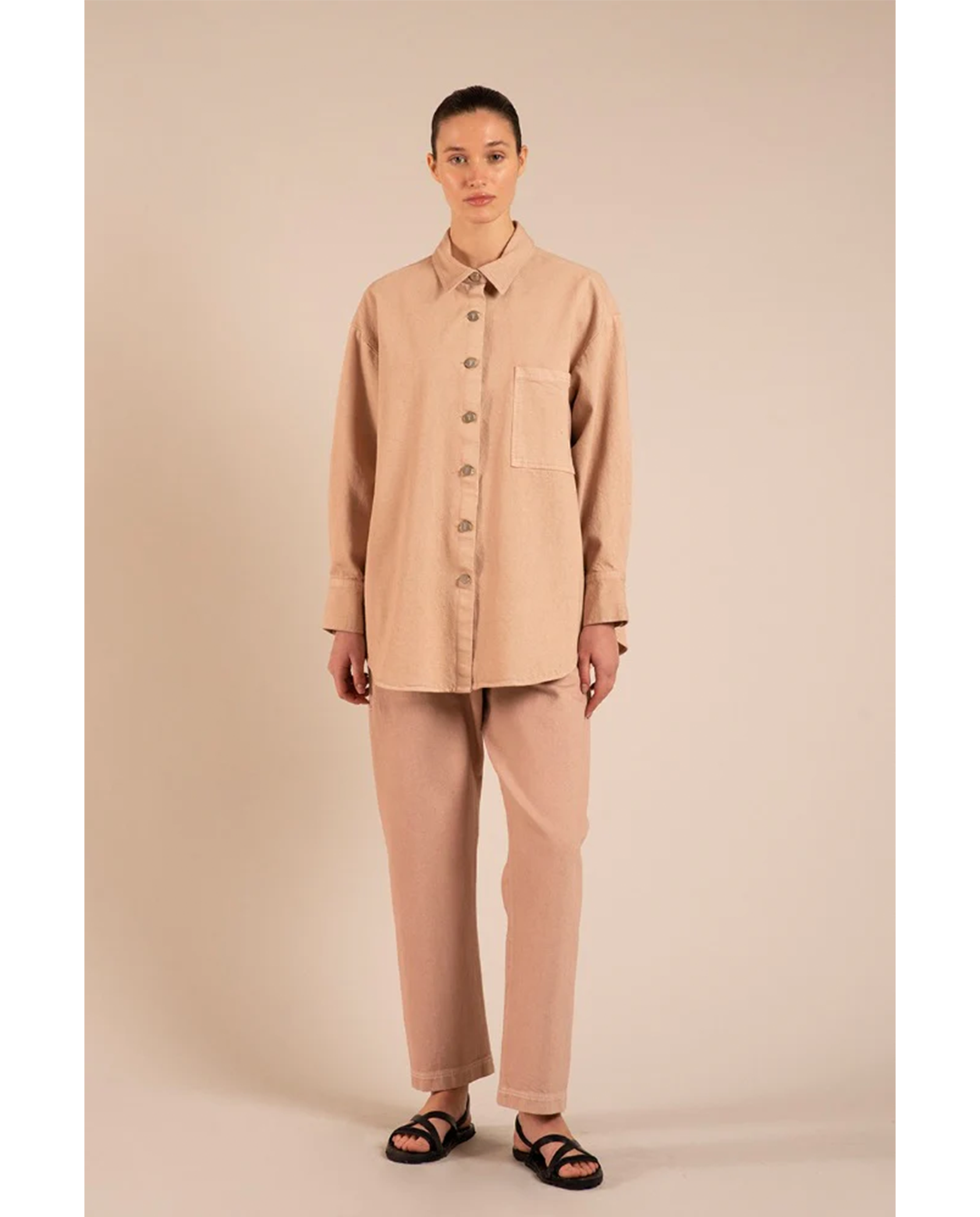 Camisa de mezclilla fabricada por productores locales teñida a mano. Silueta amplia, manga larga y cuello camisero clásico. Con bolsillo de parche al frente, botones metálicos al frente y en puños.