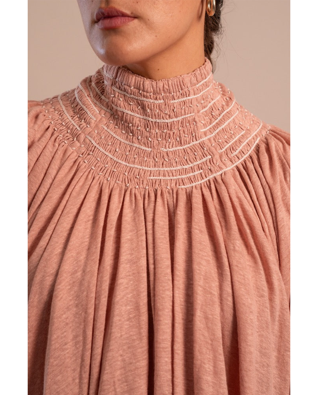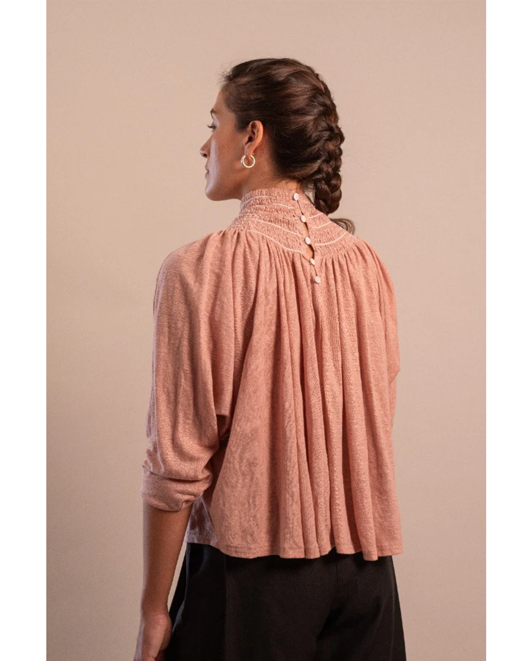 Top de lino bordado con técnica de rococó y cadeneta en la comunidad de Yakampot, San Juan Chamula, Chiapas. Top silueta recta, manga tipo murciélago larga, cuello alto con 11 carriles de plisados, abotonadura oculta en espalda.