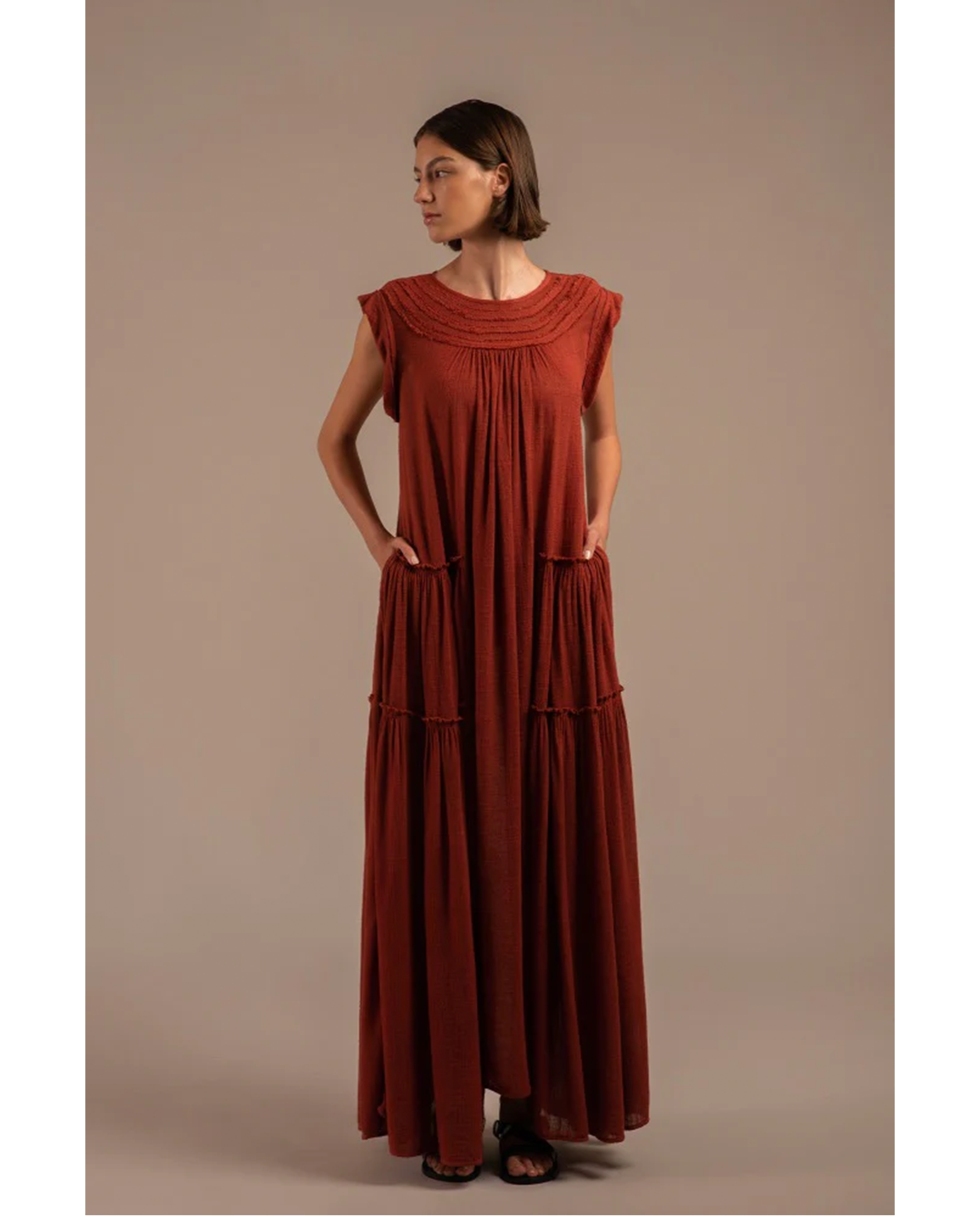 Maxi vestido icónico con escote redondo y mangas gajo dobladas.