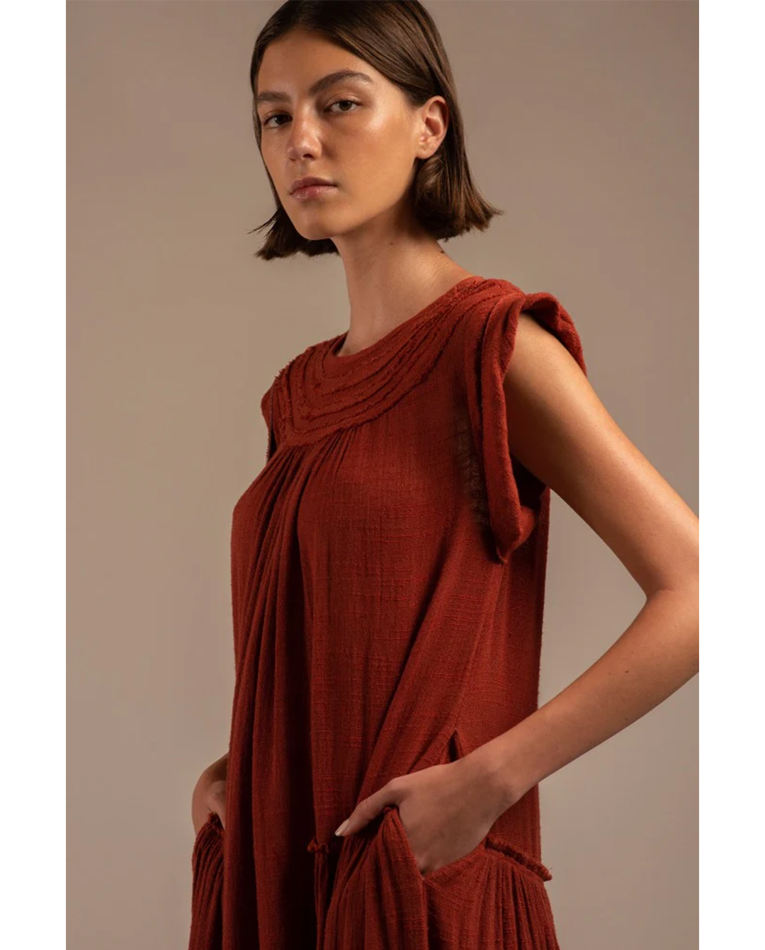 Faldón largo tipo campesino con plisados al frente y atrás. El teñido de esta prenda es realizado de manera artesanal por lo que pueden presentarse variaciones de color o de desteñido en la primera lavada.