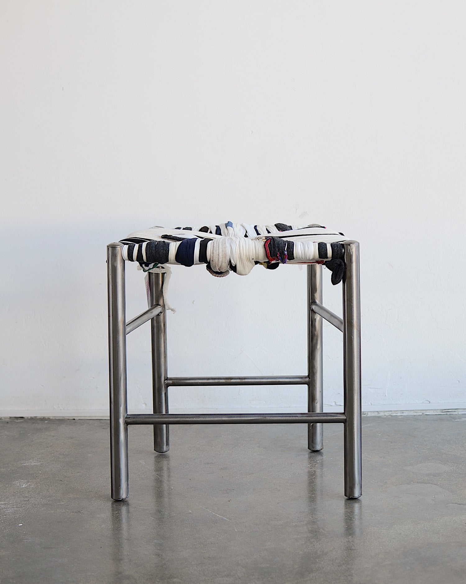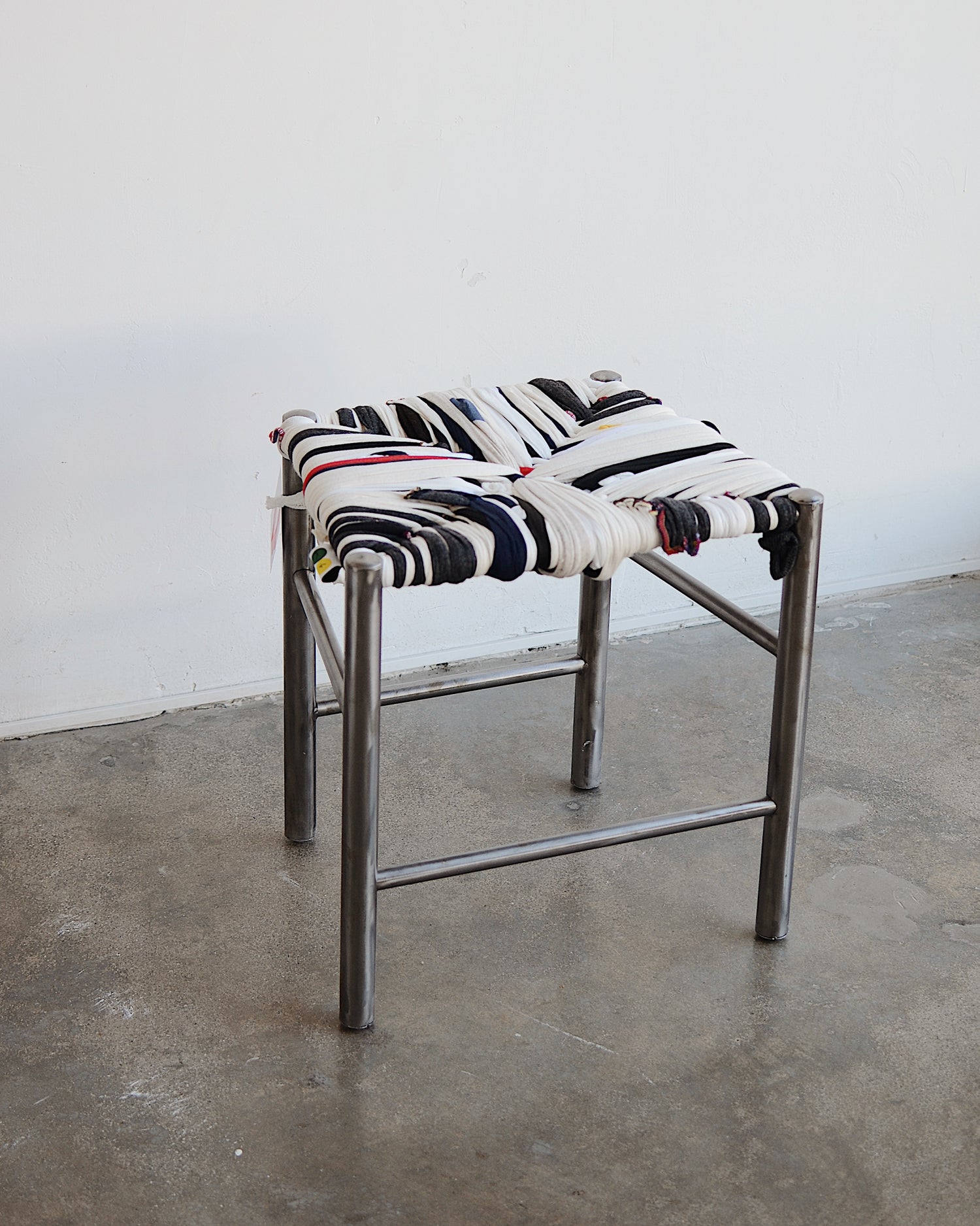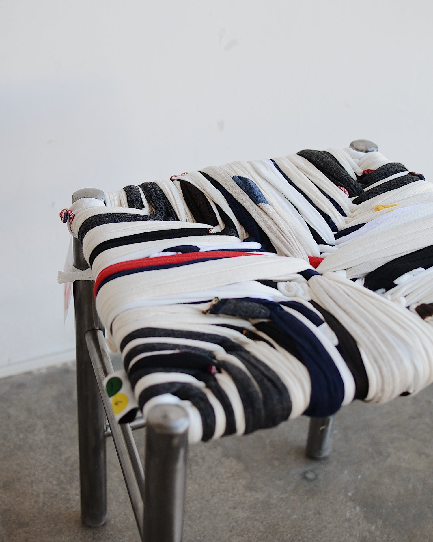 Acero inoxidable, algodón, acrílico, poliamida y elastano en diferentes porcentajes. Reuso de materiales unidos con costura overlock.