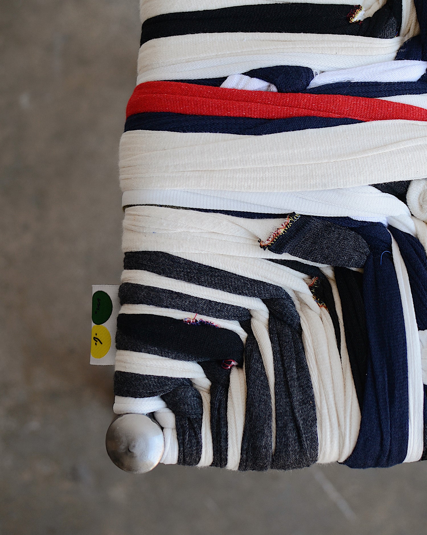Pieza hecha a partir de calcetines con errores de fabricación cosidos con colores primarios (rojo, amarillo y azul.)