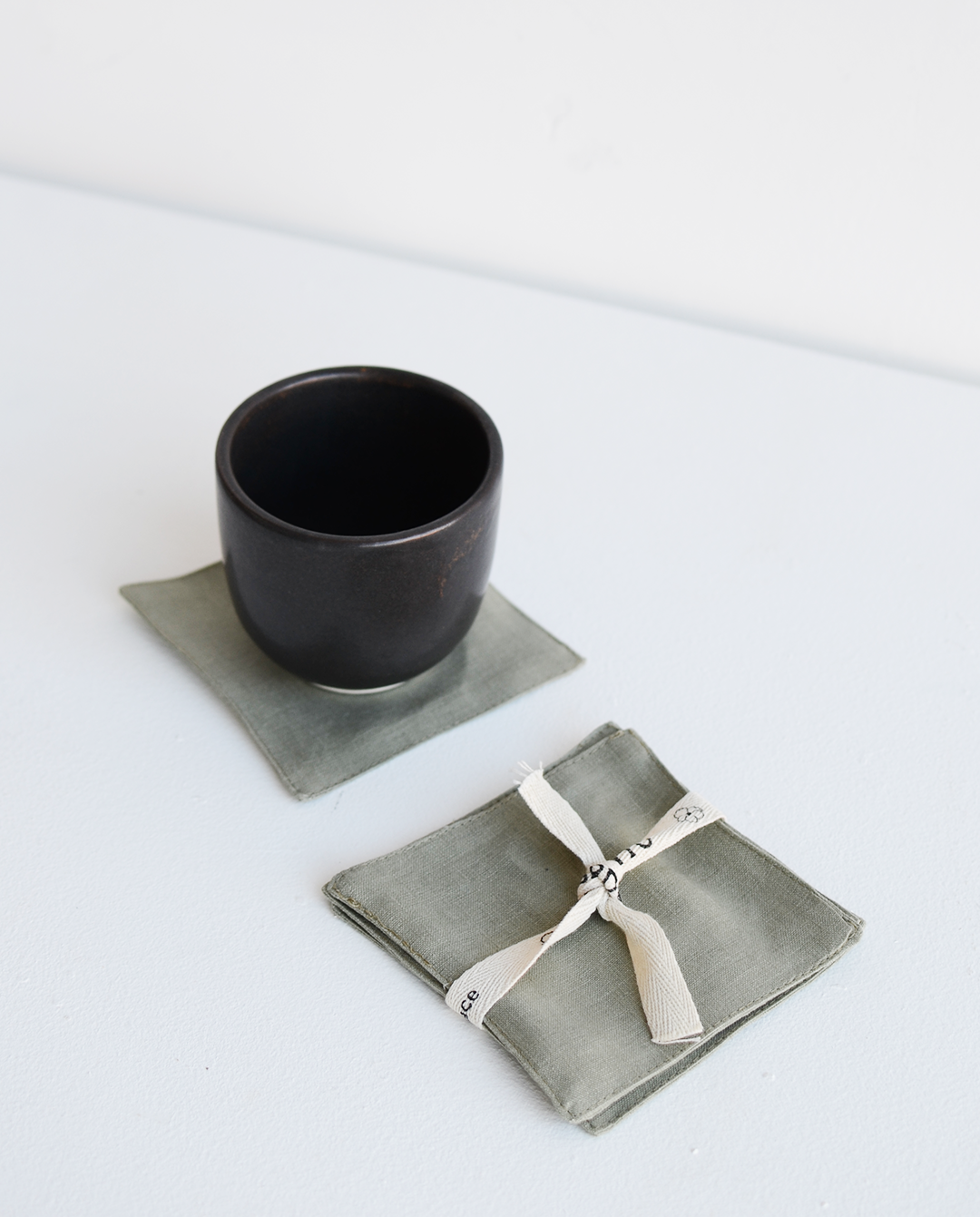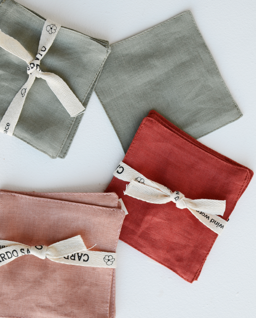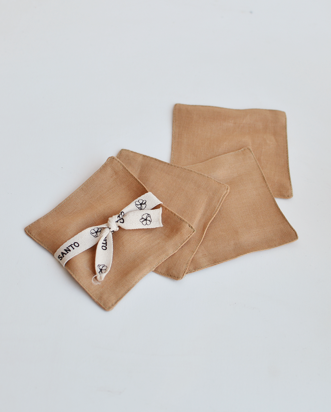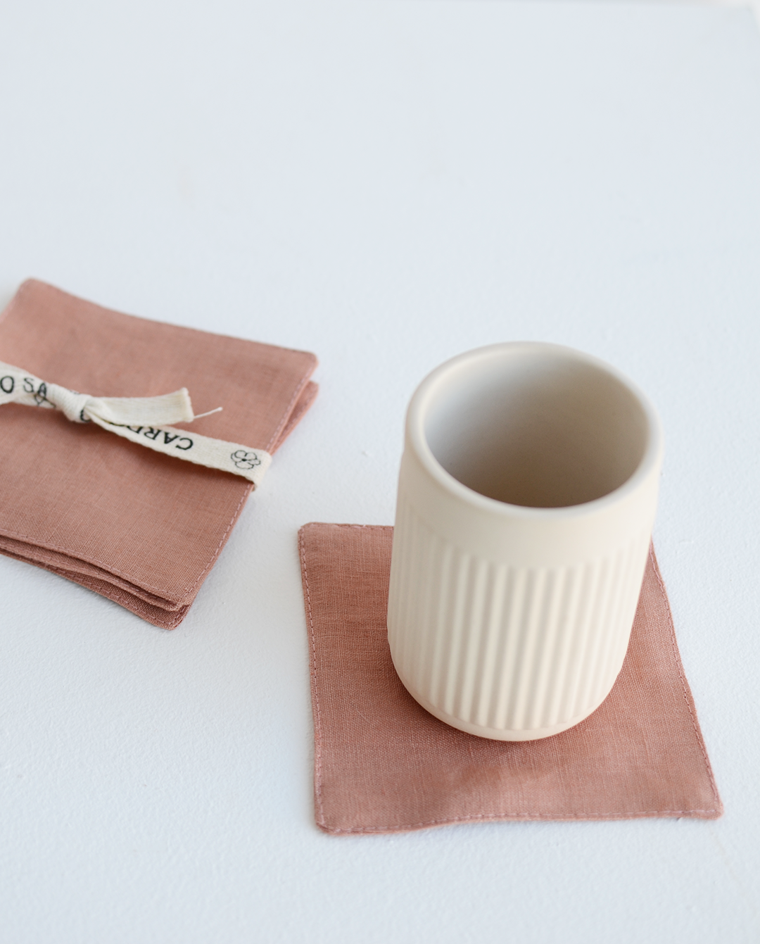 Los portavasos de Cardo Santo están hechos completamente de lino recuperado de la producción de sus batas, brindando nueva vida al residuo textil generado con la creación de nuevas piezas.