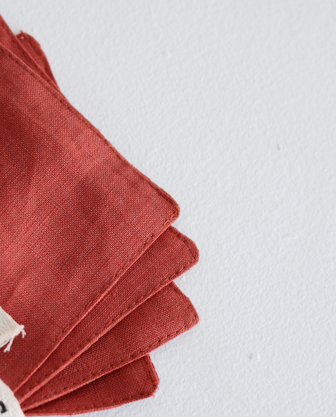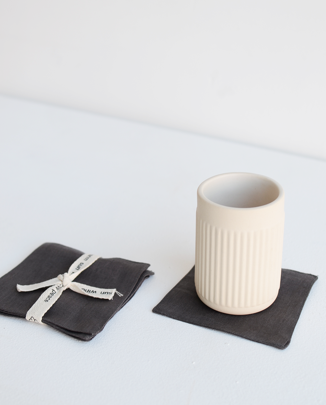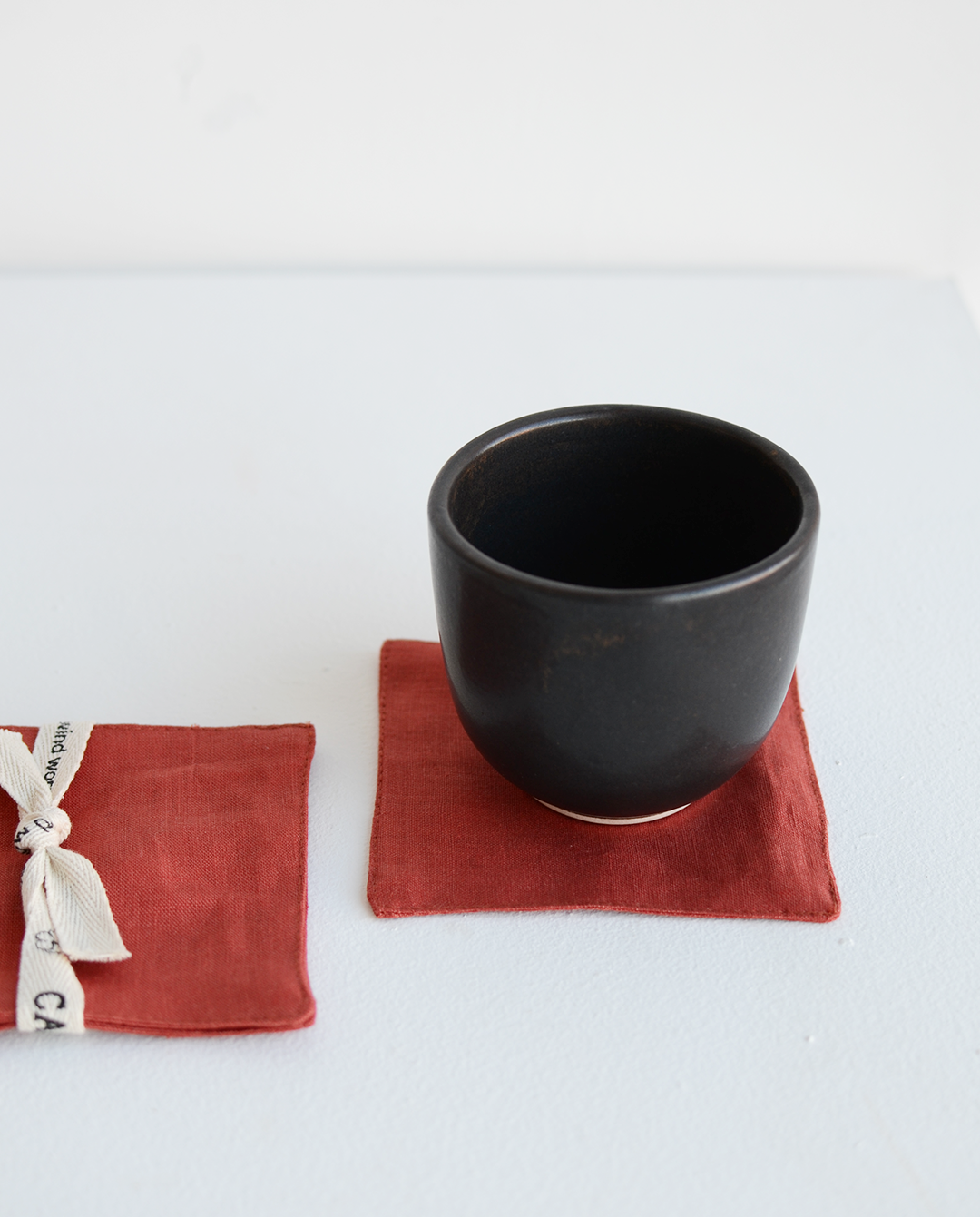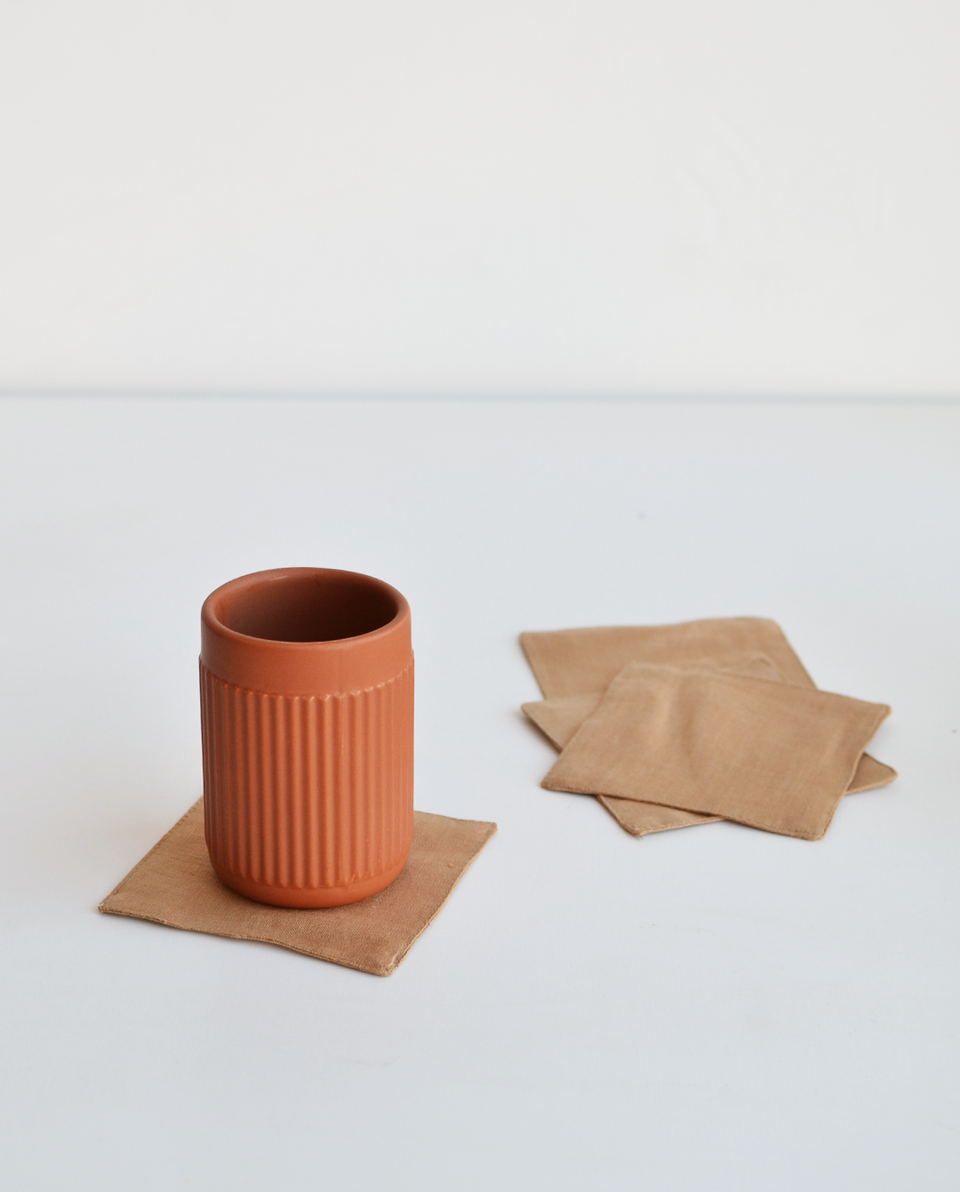 Los portavasos de Cardo Santo están hechos completamente de lino recuperado de la producción de sus batas, brindando nueva vida al residuo textil generado con la creación de nuevas piezas.