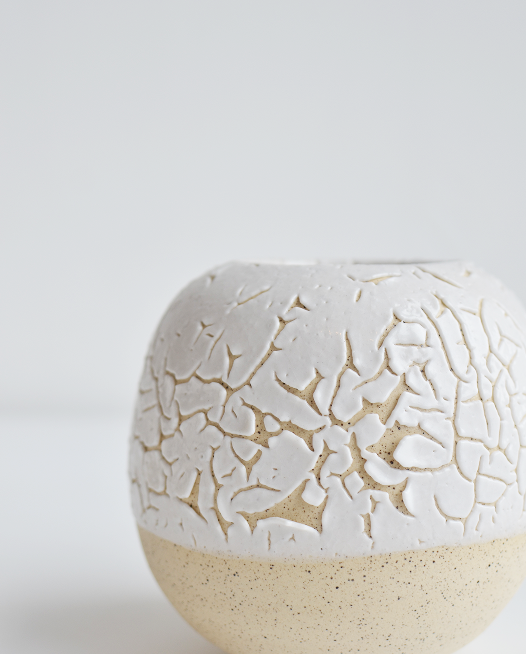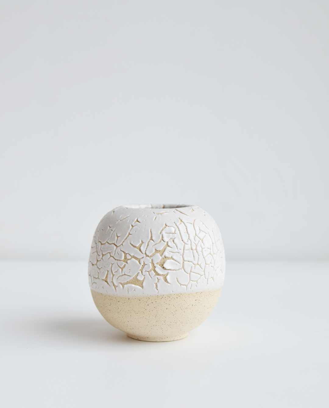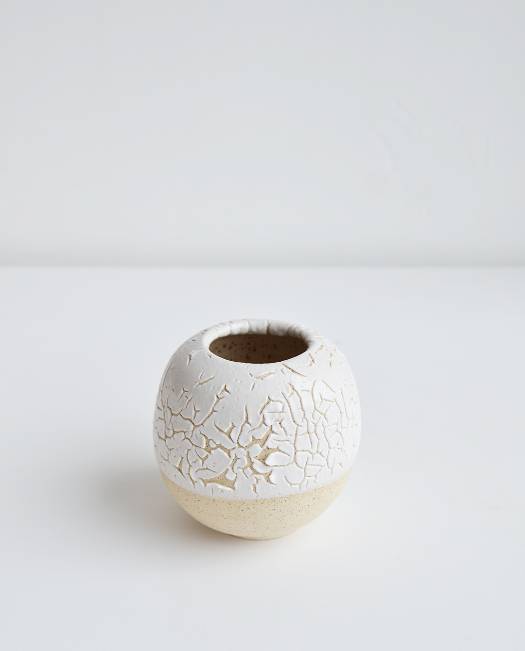 Creación de una serie de contenedores cerámicos de mediano y pequeño formato con acabados de pasta blanca y/o porcelana con una aplicación en la parte superior de un esmalte con reacción craquelada en acabado monocromático y texturizado.