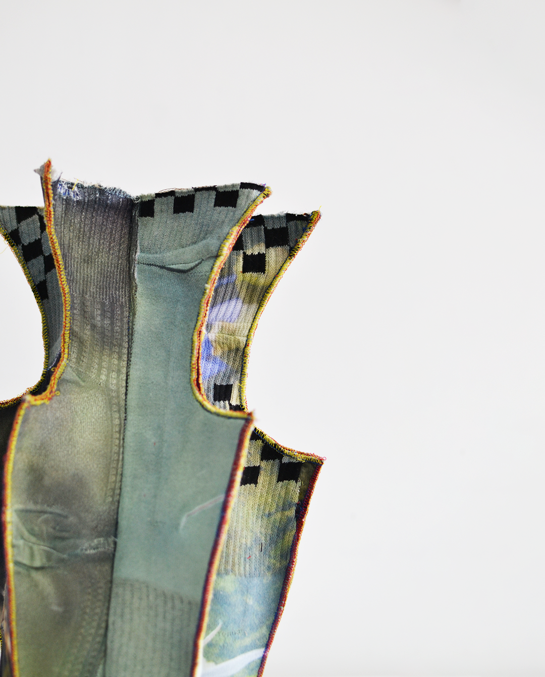 Pieza única hecha a partir de calcetines con errores de fábrica. Con fotografías de peces tomadas en el CECUT.