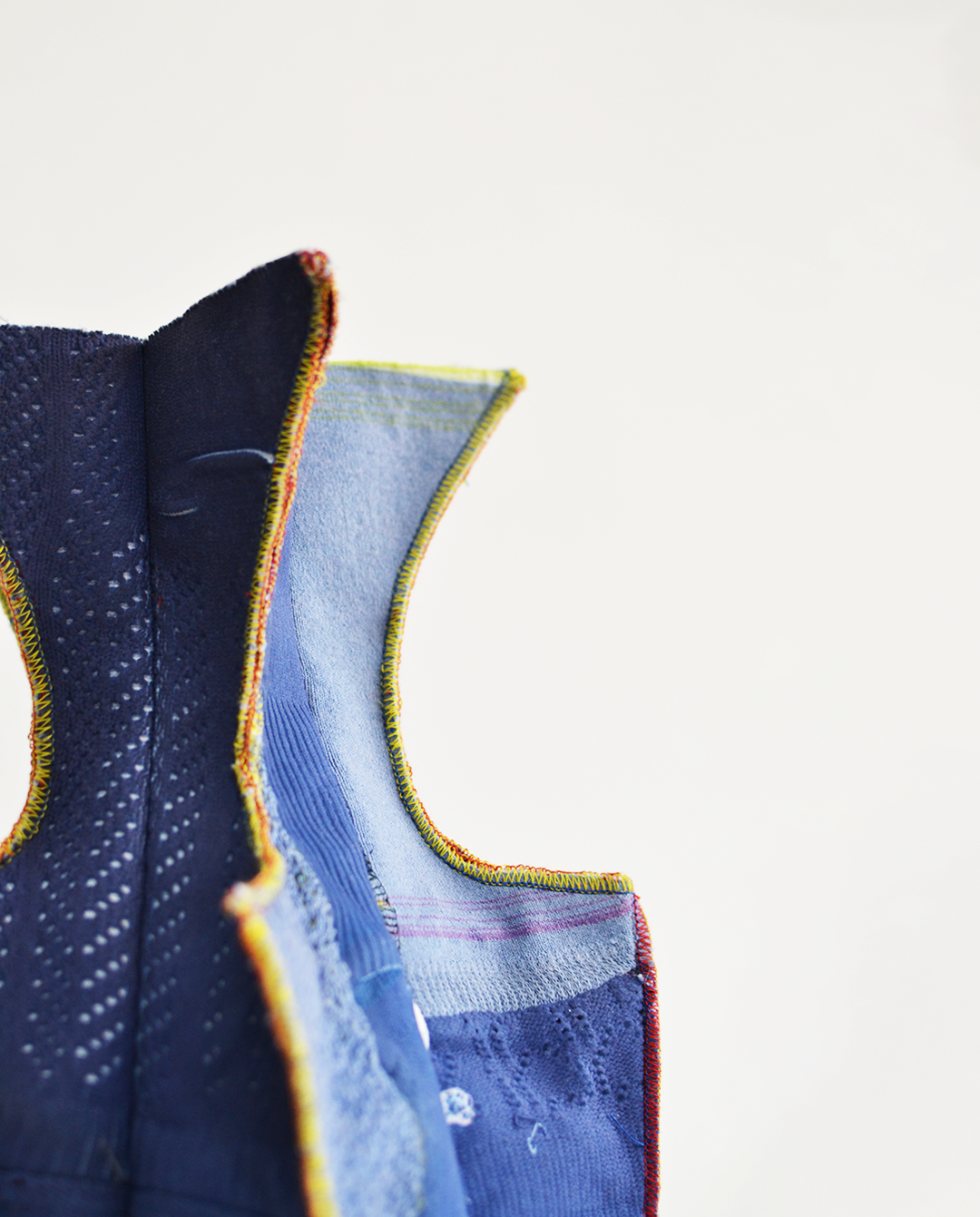 Pieza única hecha a partir de calcetines con errores de fábrica. Con fotografías de peces tomadas en el CECUT.