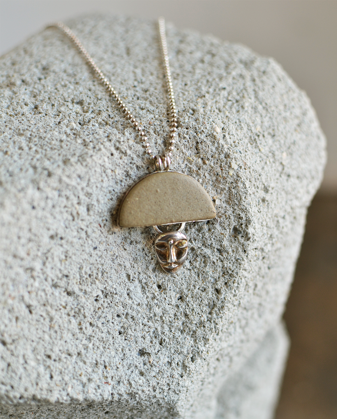 El collar Nocturna combina metales, minerales y vidrio. Cada pieza en Mino Mino es única, está hecha a mano y a través de técnicas mixtas de metalurgia y alfarería nos cuenta una historia.