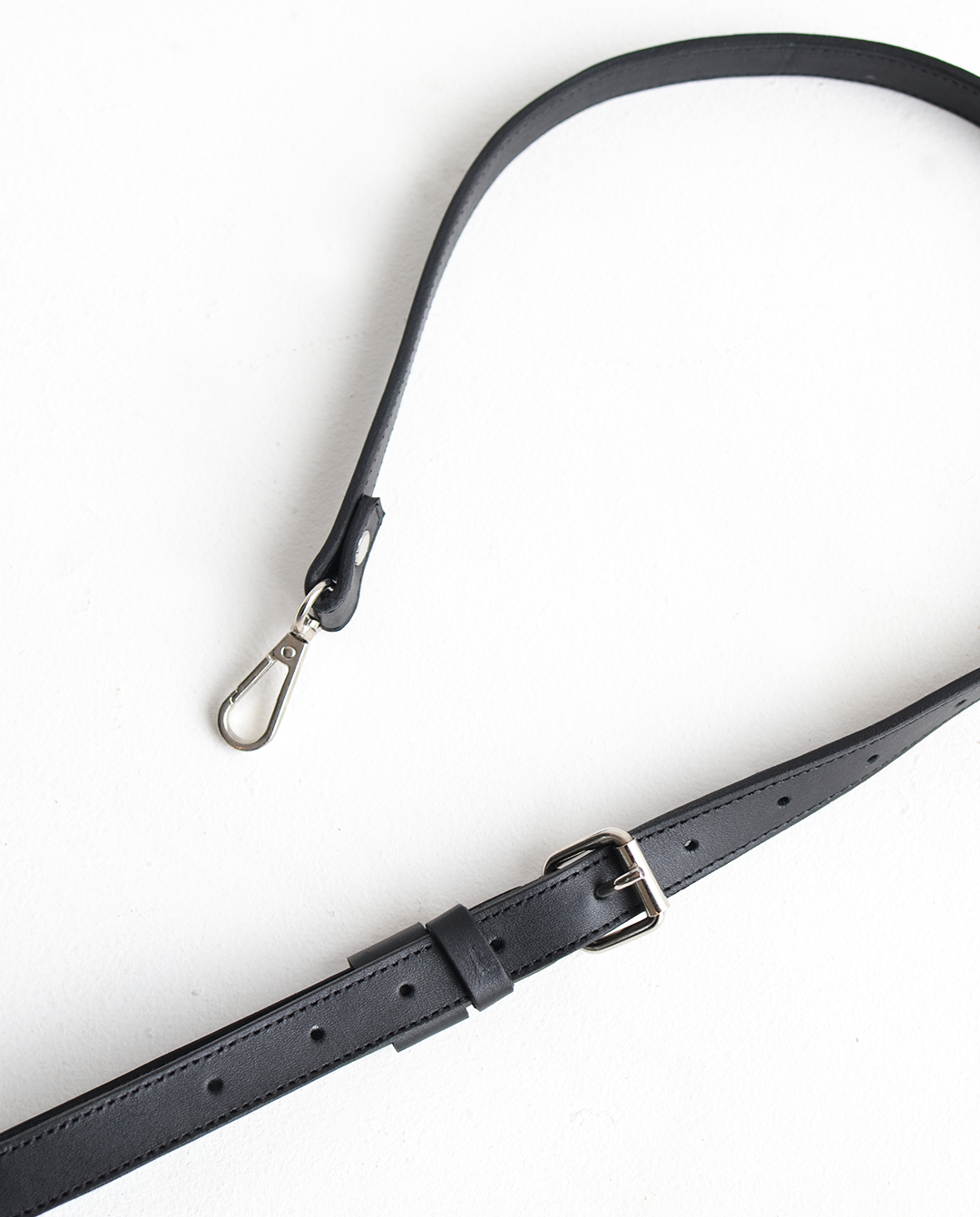 Cuero de bovino color negro y herrajes metálicos con acabado plateado.