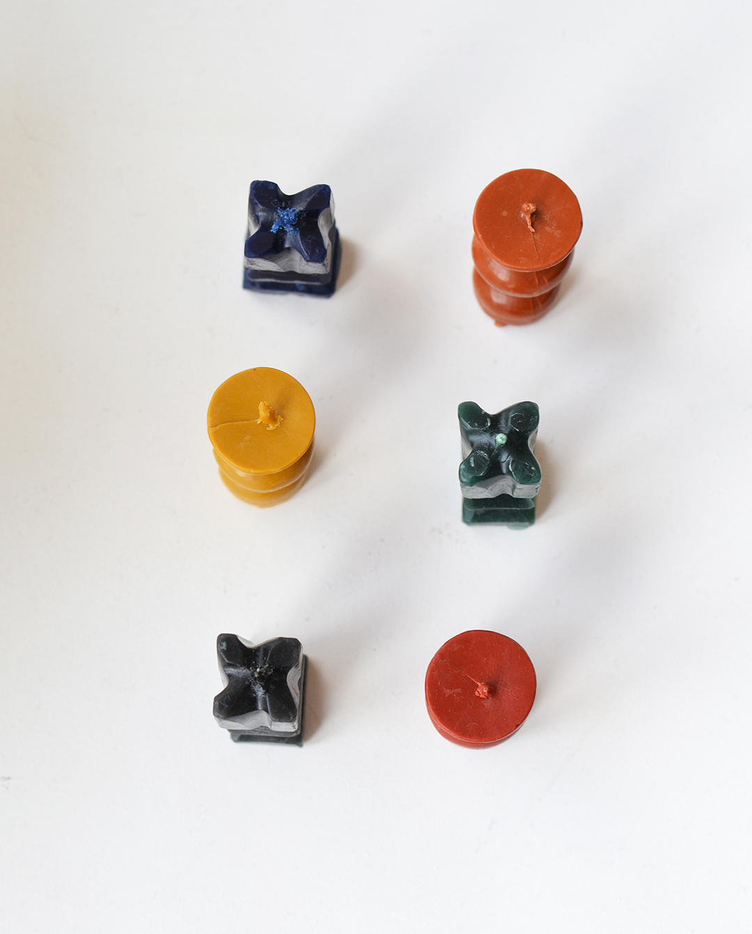 Figurines decorativos abstractos en cera de abeja, hechos en color mineral de alta pigmentación.