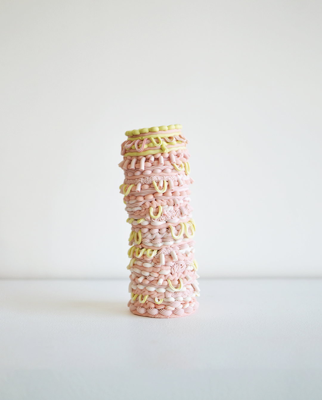 Porcelana pigmentada, encimada a partir de capas hechas con mangas pasteleras. Quemado a 1200° C.