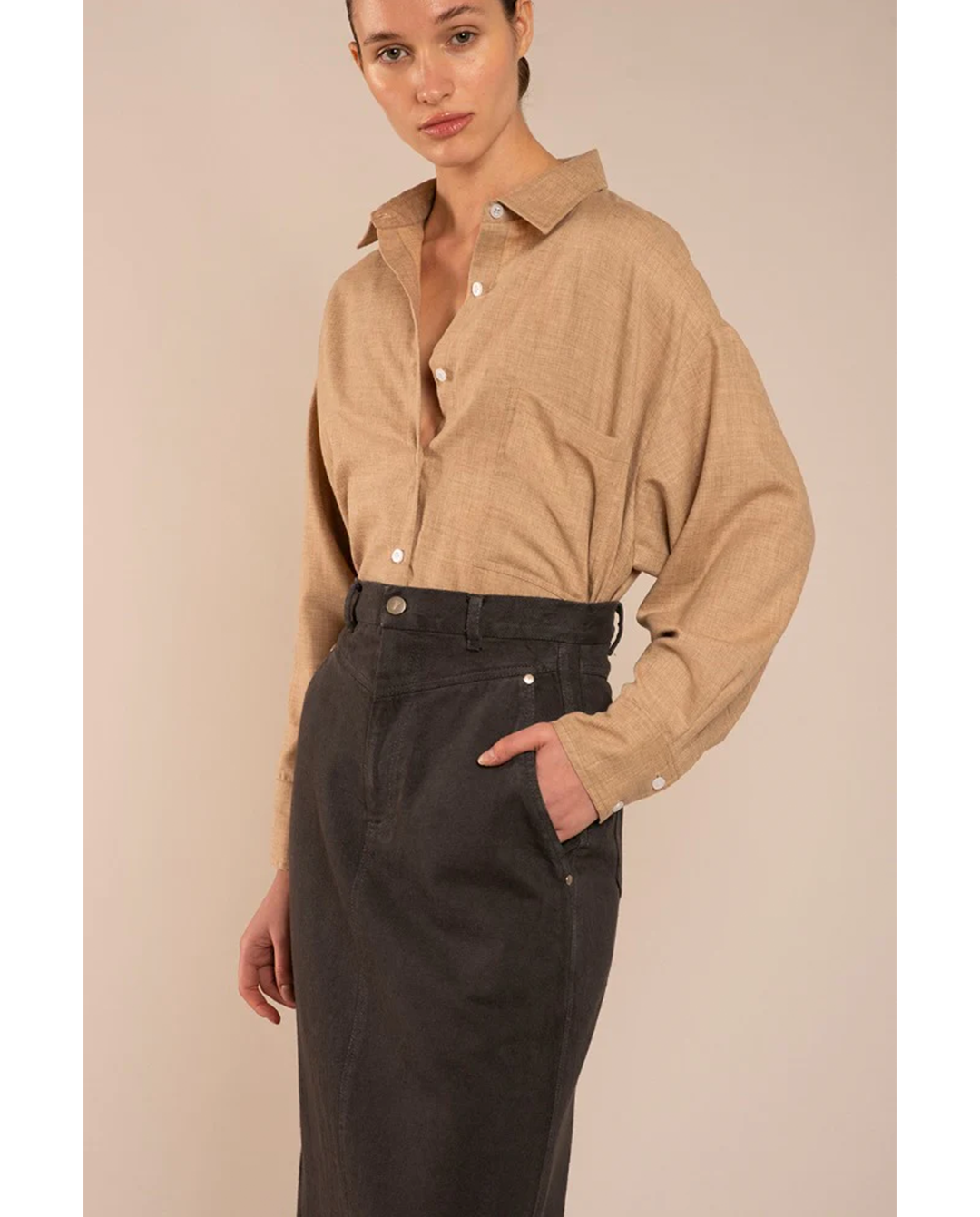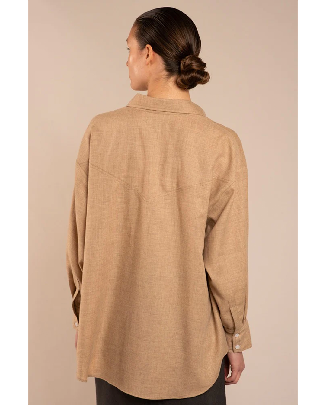 Silueta amplia, manga larga y cuello camisero clásico. Con bolsillo de parche y botones al frente y en puños.