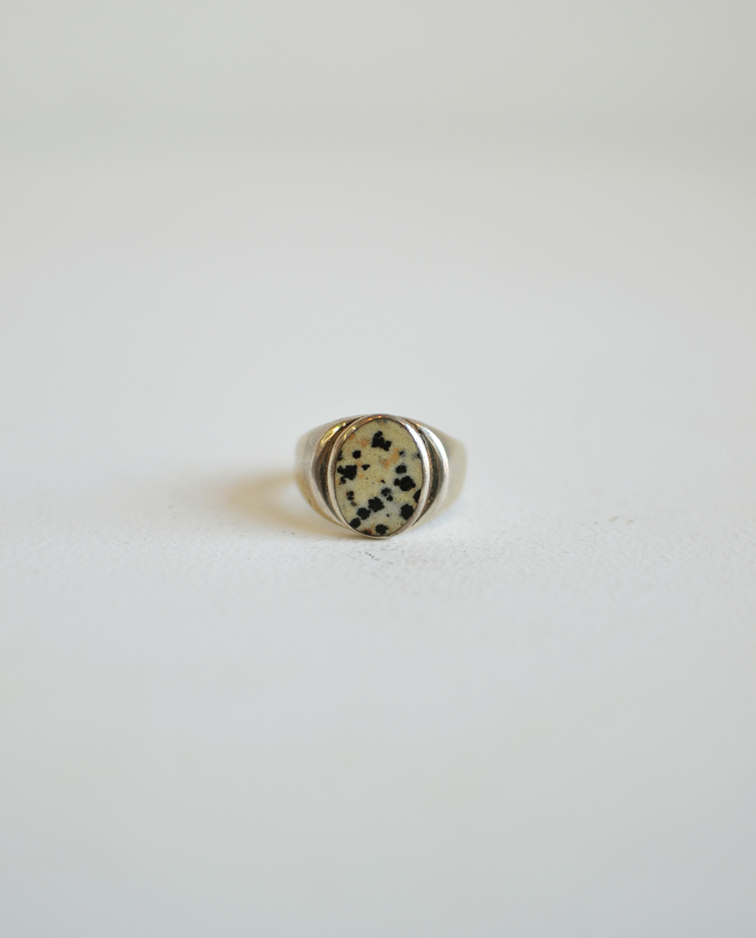 El jaspe dálmata es una piedra que ayuda a disolver patrones emocionales dañinos, fomentando la transformación personal. También fomenta la determinación, ayudándote a mantenerte comprometido con tus metas. Este anillo representa un estilo audaz, sencillo y elegante.
