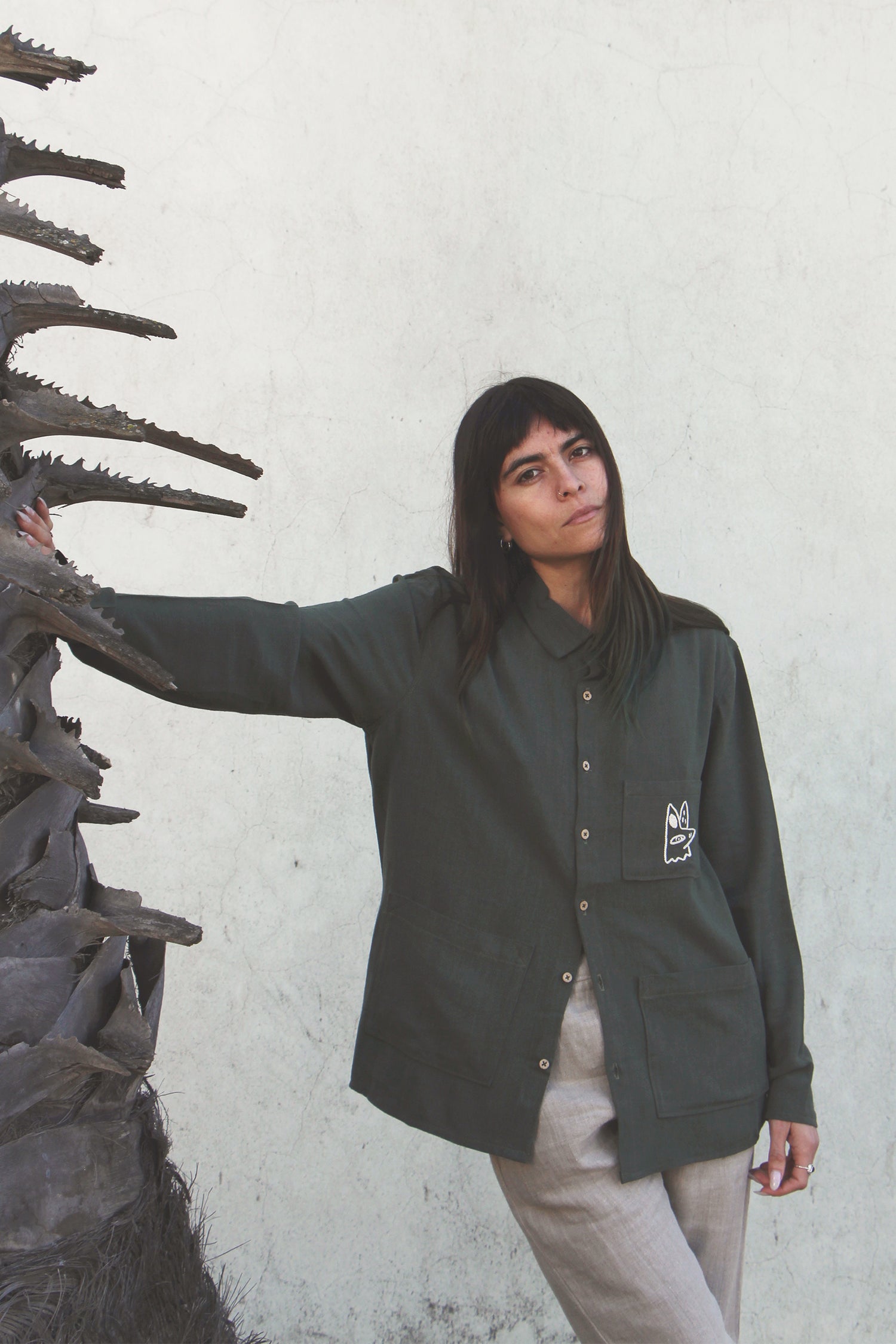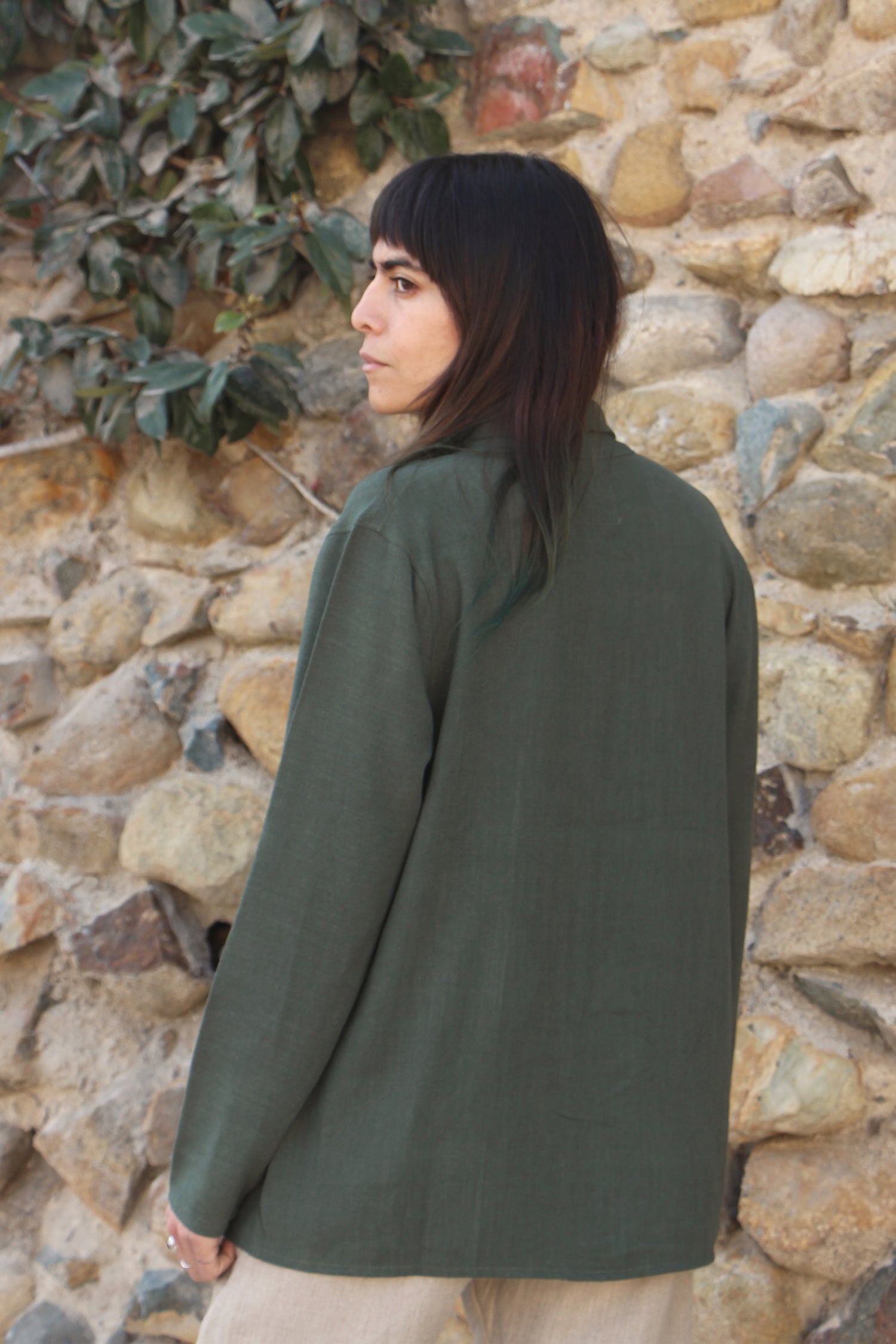 Camisa de lino, manga larga, bolsillo , bordado en algodón, color verde.